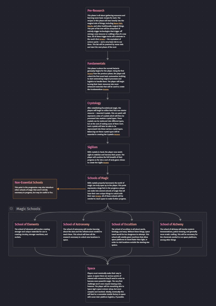 Well! I haven’t exactly kept up with the once per week idea on these blog posts, but here I am! I have a lot to talk about for Arcana, my Factorio mod. High-level planning for everything up to reaching space has been planned out and I’m starting to get into the details and actually implementing some of the ideas into the mod.