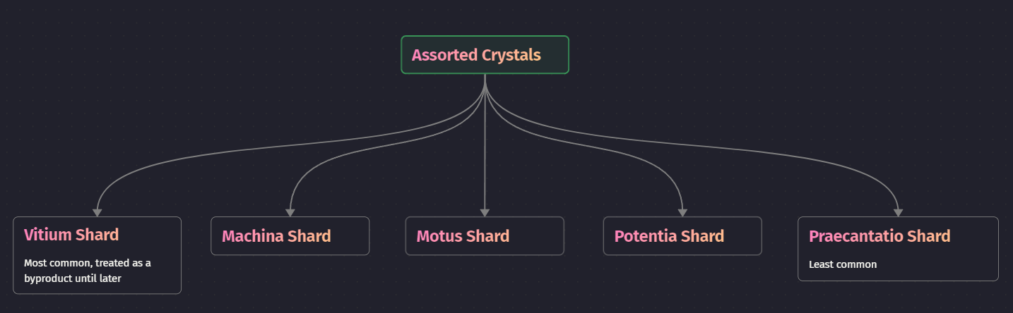This will work similarly to how recycling works in Space Age; each product will have a chance to result from sorting a crystal, with rarer products having a smaller chance. Due to the nature of how Factorio’s random recipes work, some assorted crystals could provide all of the shards if you’re lucky or none of them if you’re unlucky. The idea here is that the player will start accumulating these vitium shards with nothing to do with them (for the moment) while trying to get the higher rarity shards. As a small side note, all of these shard names are inspired by the Minecraft mod Thaumcraft, with their names being derived from Latin words. Vitium means vice, defect, or flaw, Machina means machine or mechanics, Motus means movement or motion, Potentia means power, force, or strength, and Praecantatio means sorcery or magic. As an aside to the side note, I find it really interesting that the root of the Latin word for magic (cantatio) is related to music and singing, and I might make use of that down the line. Anyways, I haven’t quite nailed down exactly what the production chain will be from this point on with the crystals, but suffice to say, the player will use these crystals to make other types of crystals they couldn’t get from sorting, which they’ll then use to make liquid mana, the upgraded arcane interface, and the crystalis arcana.